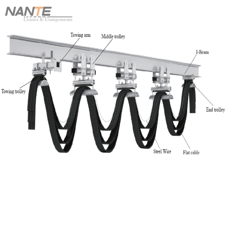 Festoon system is a mobile power supply system for crane cross travel and short distance long travel. Nante’s festoon system is safety and reliability, easy for installation and maintenance. Nante can offer C track festoon system, I beam festoon system, wire rope festoon system, angel bar festoon system, for selection. In additions, NANTE can provide customized curved track, stainless steel, stainless steel with plastic coating for heavy corrosive environment to meet customer’s special request and different site condition.