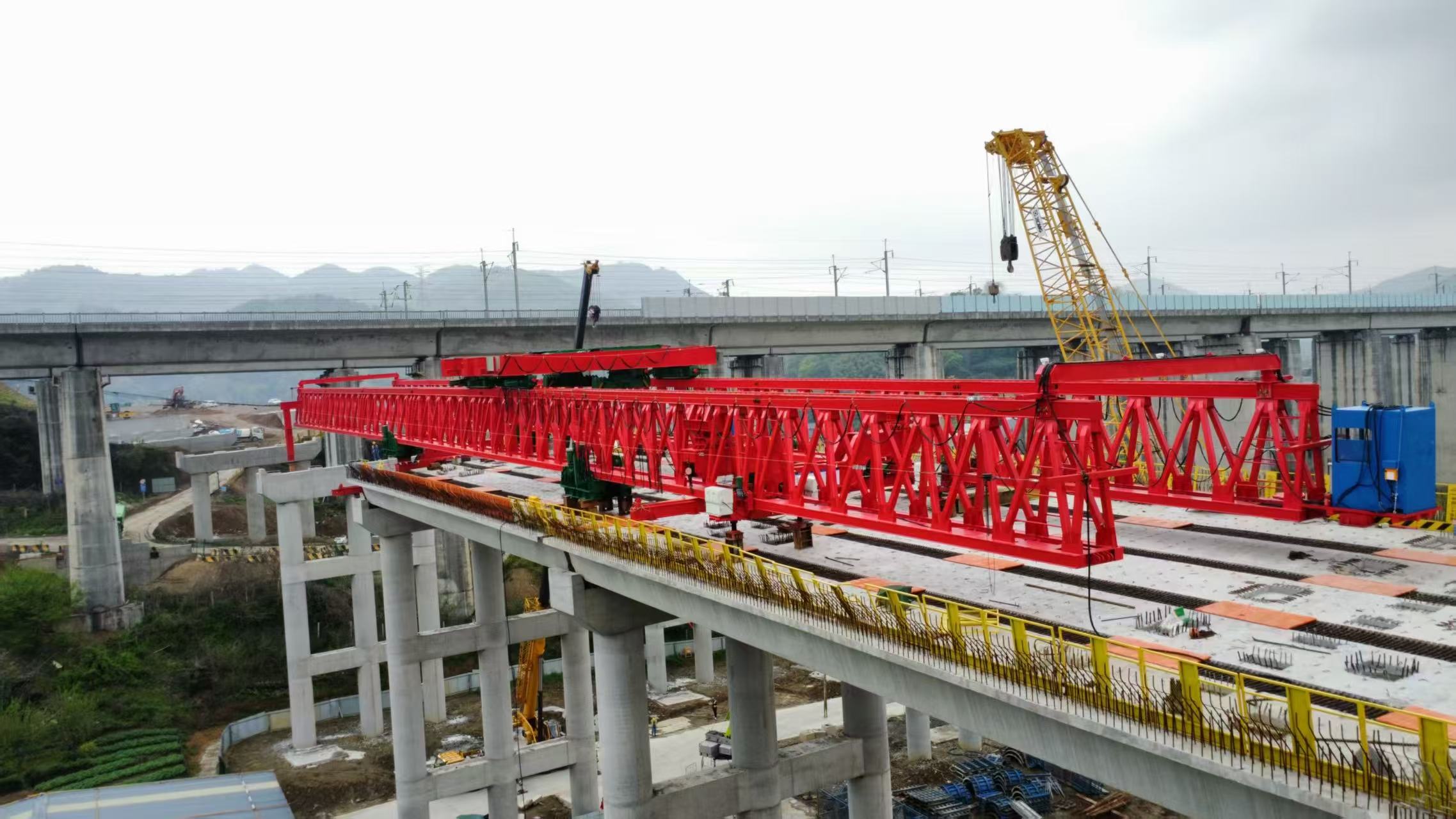 The construction environment for this project was exceptionally unique: an active, bustling high-speed rail viaduct loomed overhead, while new bridge girders awaited installation directly underneath. The vertical clearance was severely restricted, rendering conventional launching gantries completely incapable of operating effectively.
